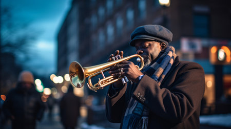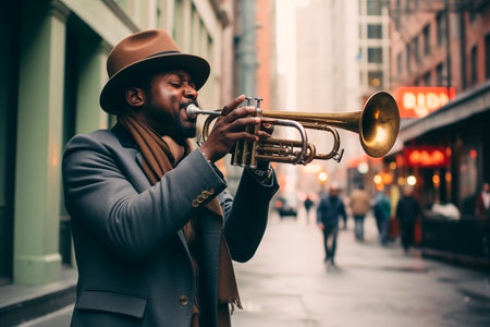 Urban sidewalk trumpeter playing soulful tunes instrument case for donations