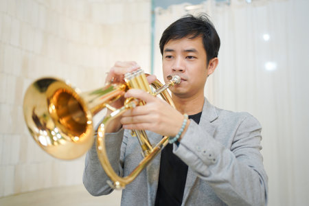 A solo Asian skillful musician is playing or practicing cornet in the restaurant. A man enjoy playing cornet or trumpet.