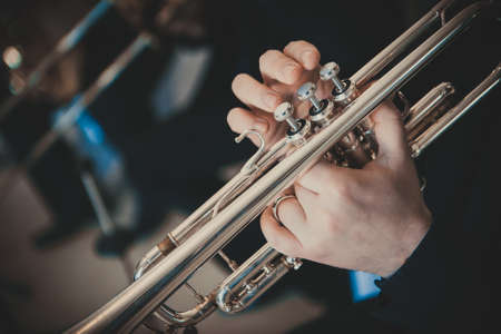 Trumpet player. Trumpeter hands playing wind musical instrument