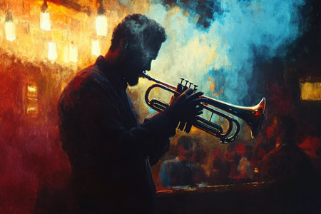 In a dimly lit jazz club, a musician passionately plays his trumpet, surrounded by swirling smoke and the ambiance of live music. The atmosphere pulses with energy and creativity.