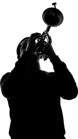 This captivating image features a silhouette of a musician playing the trumpet against a dark, cloudy sky at dusk, creating a dramatic and emotional atmosphere.