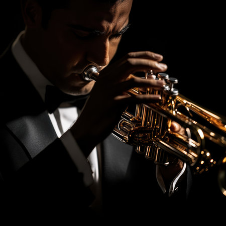 Concert hall trumpeter formally dressed trumpet gleaming under lights