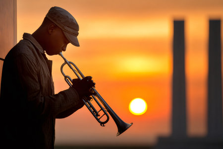 Musician is playing the trumpet during a vibrant sunset, with industrial chimneys in the background