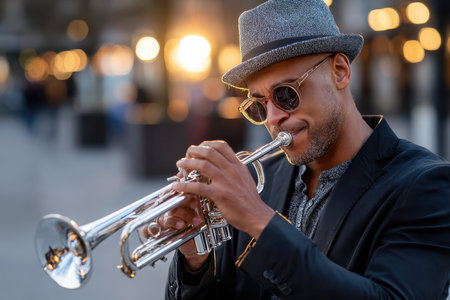 A talented musician performs on trumpet as warm sunlight creates a glowing backdrop in the city.