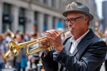 A skilled musician plays his trumpet passionately on a bustling city street filled with festival-goers.