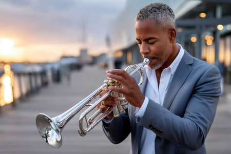A skilled musician performs on trumpet by the water as the sun sets, creating a warm and vibrant atmosphere.