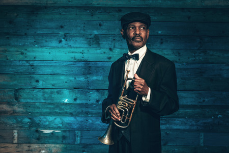 Vintage african american senior jazz musician with trumpet in front of old wooden wall. Wearing black suit and cap.