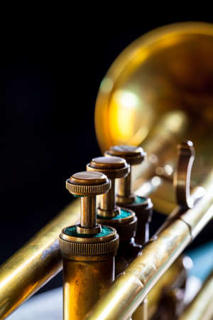 Golden trumpet brass musical instrument valve mouthpiece reflective shiny studio spotlight soft light