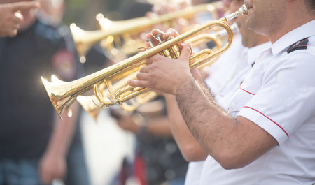 musicians of the military brass band plays the musical instruments