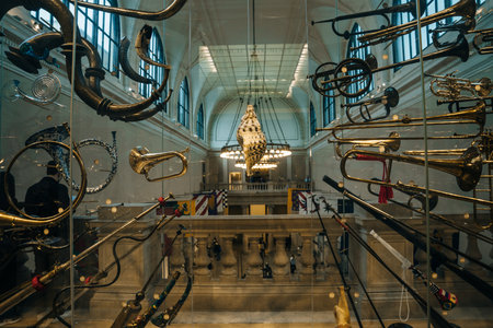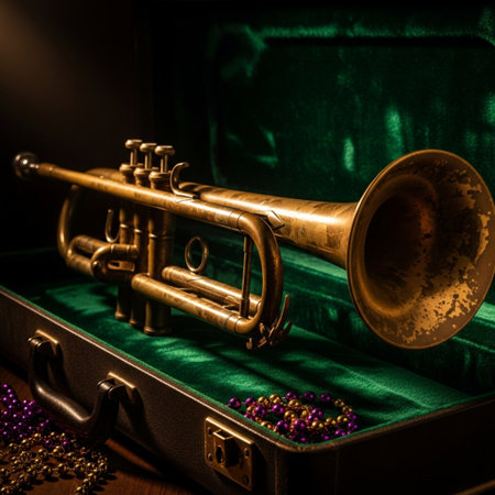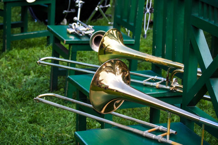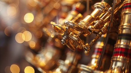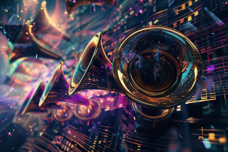 Shiny brass instruments reflect musician focus on foreground performance generated by artificial intelligence