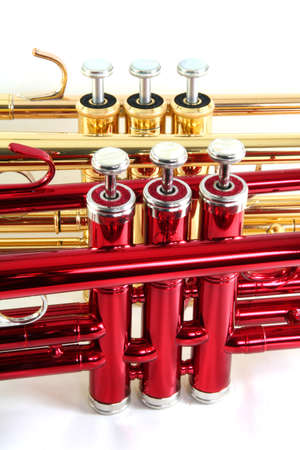 Close-up of a red and a gold trumpet on white
