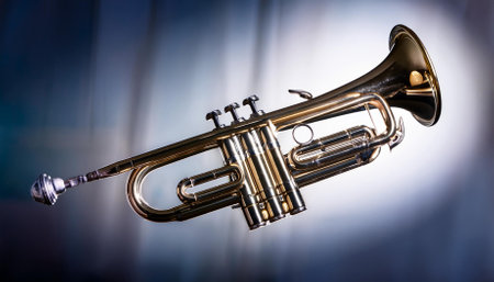 A shiny trumpet is shown in a background. The trumpet is the main focus of the image, and it is a beautiful and elegant instrument. The blue background adds a sense of depth