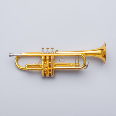 A beautifully polished brass trumpet lies against a clean white background, showcasing its intricate design and artistic craftsmanship. Perfect for music-themed projects.