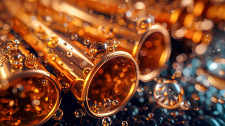 A close-up view of reflective copper pipes with circular openings. Their textures and inner surfaces are highlighted.