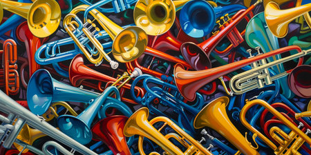 A painting of many different colored trombones and trumpets. The painting is colorful and vibrant, with the trombones and trumpets arranged in a way that creates a sense of movement and energy