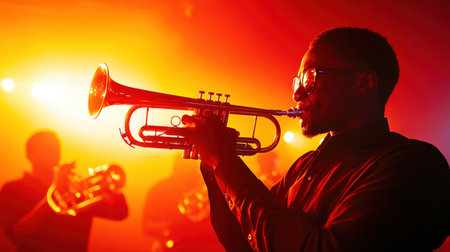 A musician passionately plays the trumpet on stage surrounded by colorful lights, creating an electrifying ambiance. The energy of the crowd reflects the excitement of the performance.