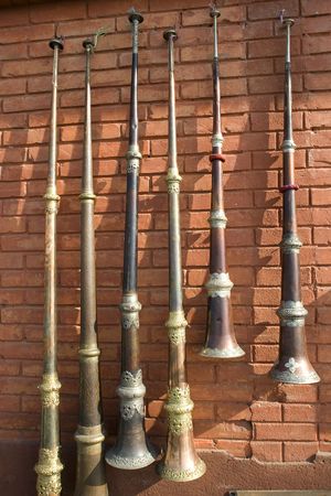 Tibetan long horns on a red brick wall in sale at Swayambhunath_Monkey Temple in Kathmandu, Nepal.