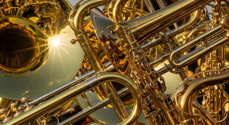 A dynamic close-up collage of various golden brass musical instruments, including saxophones, tubas, and trumpets. The polished surfaces gleam under bright light, with a prominent sun flare reflecting off one of the bells. The image evokes the powerful and vibrant sound of a marching band or symphony orchestra.