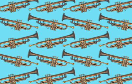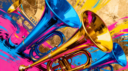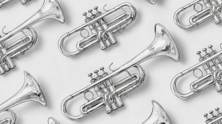 Explore a stunning illustration featuring shiny trumpets arranged on a light background, perfect for musical themes and artistic projects. Ideal for designs celebrating music.