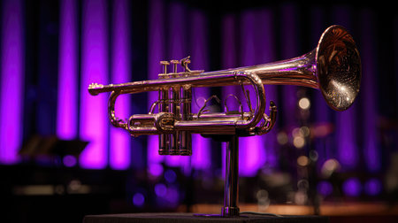 Trumpet resting on stage, waiting for the musician's touch, glowing under blue light, creating an atmosphere of anticipation and creativity