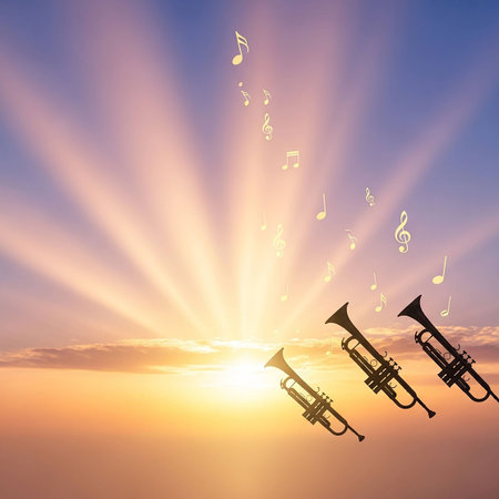 A group of golden medieval trumpets in a circular arc proclaiming a special heavenly occasion on light blue cloudy sky background
