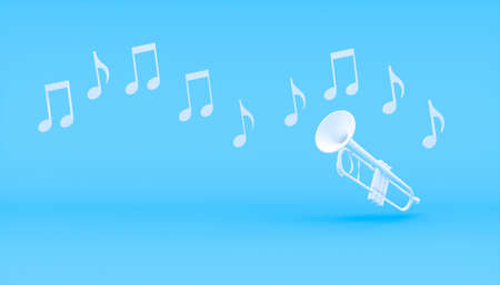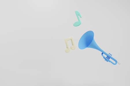 Trumpet with music note on white background. Blue trumpet with copy space. 3D rendering image.