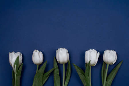 Five white tulips on a blue background, like a mothers day card, Valentines Day or birthday card.