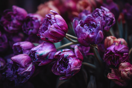 This image showcases a collection of blooming purple tulips, their petals displaying intricate textures. The composition employs a shallow depth of field, highlighting the flowers against a softer, blurred backdrop. The lighting appears natural, enhancing the rich color palette. Suitable for various editorial and commercial applications.