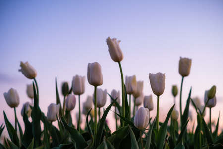 Tulip fields in the Netherlands. Tulips in bloom in springtime. Flowers as a backdrop. Natural background.