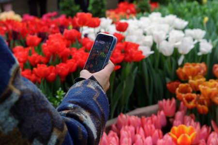 A woman takes a picture of an amazing field of tulips on her phone. Tulips in soft light on a blurred background with space for text.