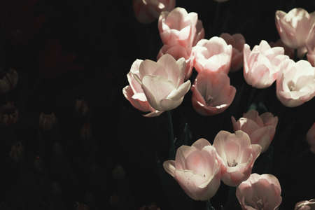 Stylish background with orange tulips and a spring flower bed, toned image wallpaper, card for mothers day.