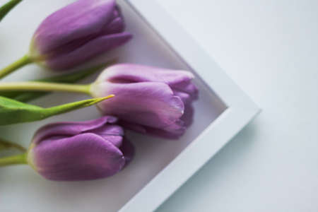 purple tulips with white frame for photo on a light background