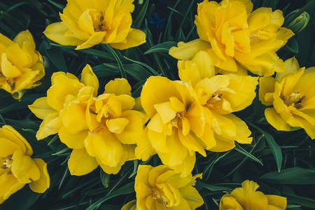 View from above on flower bed full of yellow tulips.