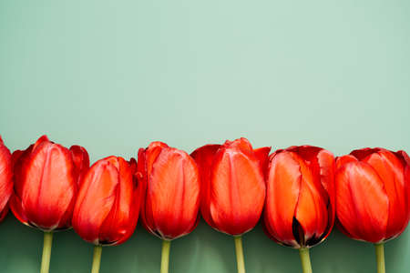 Row of fresh red tulip flowers lying on empty green background. Spring ester summer nature banner. Text space top view