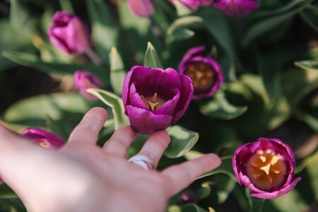 Magical Netherlands flowers landscape. Girl gently touch colorful purple tulips flowers in beautiful flower tulip fields. Famous tourist attraction in Holland on springtime. Spring concept. Soft focus