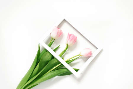 Flowers pink tulips in photo frame on white background. Wedding. birthday. Happy woman's day. mother's day. Valentine's Day. Flowers composition romantic. Flat lay, top view, copy space