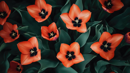 A breathtaking overhead view of vibrant orange tulips featuring striking dark centers, surrounded by lush green leaves, showcasing the beauty of nature in bloom.