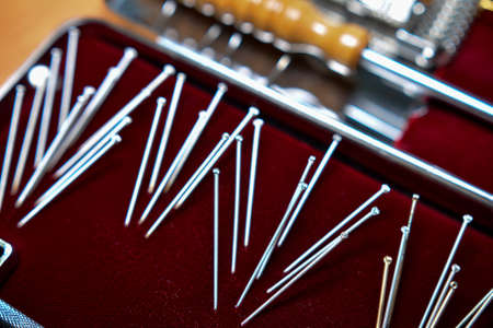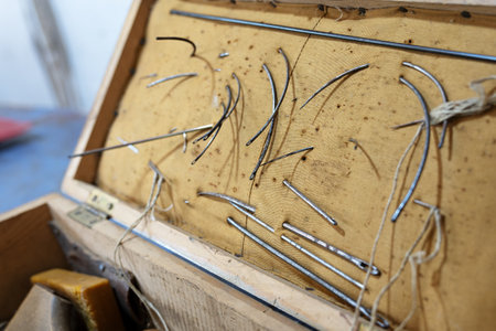 Straight and curved upholstery needles pinned in the wooden toolbox of a craftsman, selected focus, very narrow depth of field