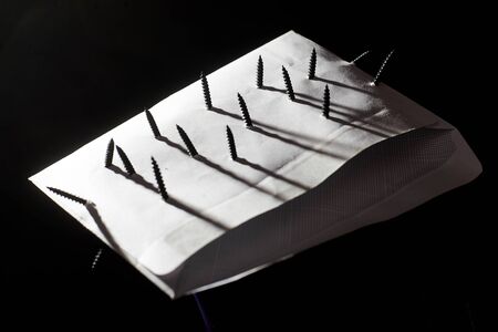 A dangerous envelope with screws sticking out of it holds a gloved hand.