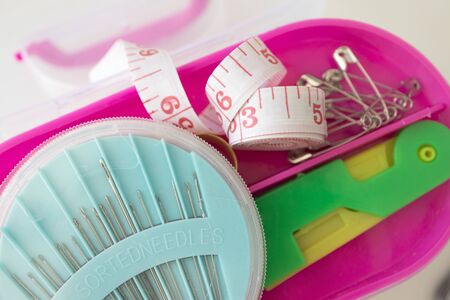 Tailoring sewing kit multipurpose accessories for travel with box, close-up. Needles, measure tape and other