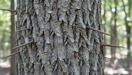 The textured trunk of a coniferous tree is photographed vertically into the sky. A frame with branches of a coniferous tree and a textured trunk, against the sky.