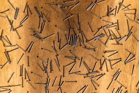 Close up small steel nails on wooden background,Construction materials,For design pattern