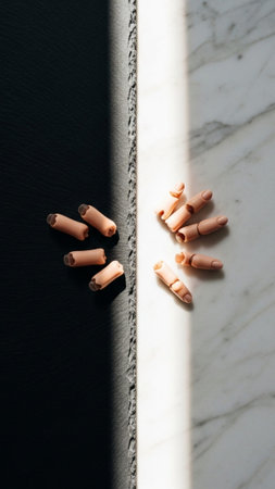 A razor-sharp ray of natural sunlight perfectly bisects a composition of dark slate and white marble, symbolizing the precise balance of the Vernal Equinox.