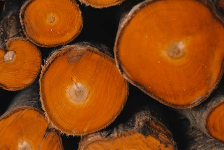 Background of wooden logs. Year rings. Pile wood. Deforestation theme. Wood industry. Chopped wood. Woodpile scene.