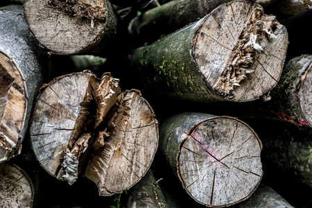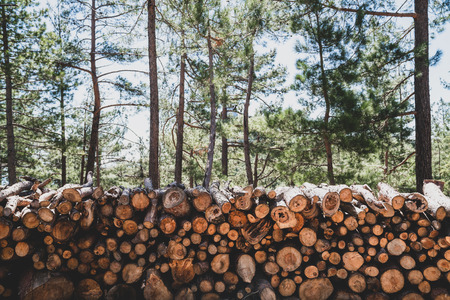 Deforestation concept - logging timber in wood industry, pile of cut off tree trunks, selective focus