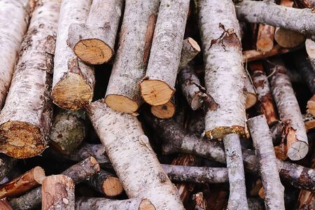 Pile of wood logs background. Round wooden texture. Freshly cut tree wooden logs for winter