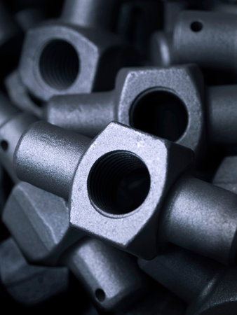 A close-up view of metallic fasteners and threads on industrial machinery showcases intricate details and textures, perfect for engineering and manufacturing themes.