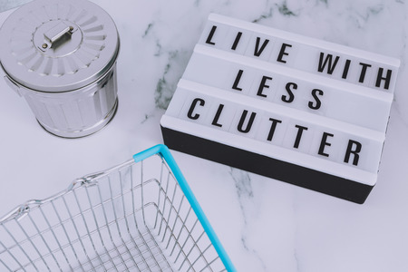 ecology and consumerism concept: live with less clutter message on lightbox with shopping basket and trash bin