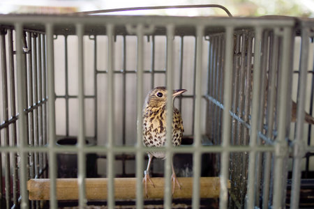 Songthrush in cage for hunting, calling. Italy.