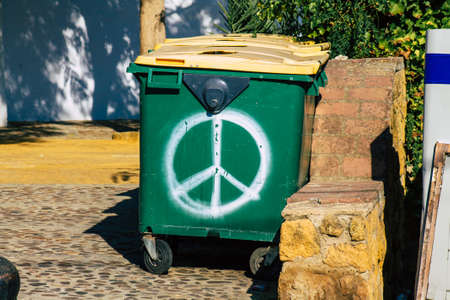 Carmona Spain July 26, 2021 Garbage container in the streets of Carmona called The Bright Star of Europe, the town shows a typical narrow and meandering Arabic layout